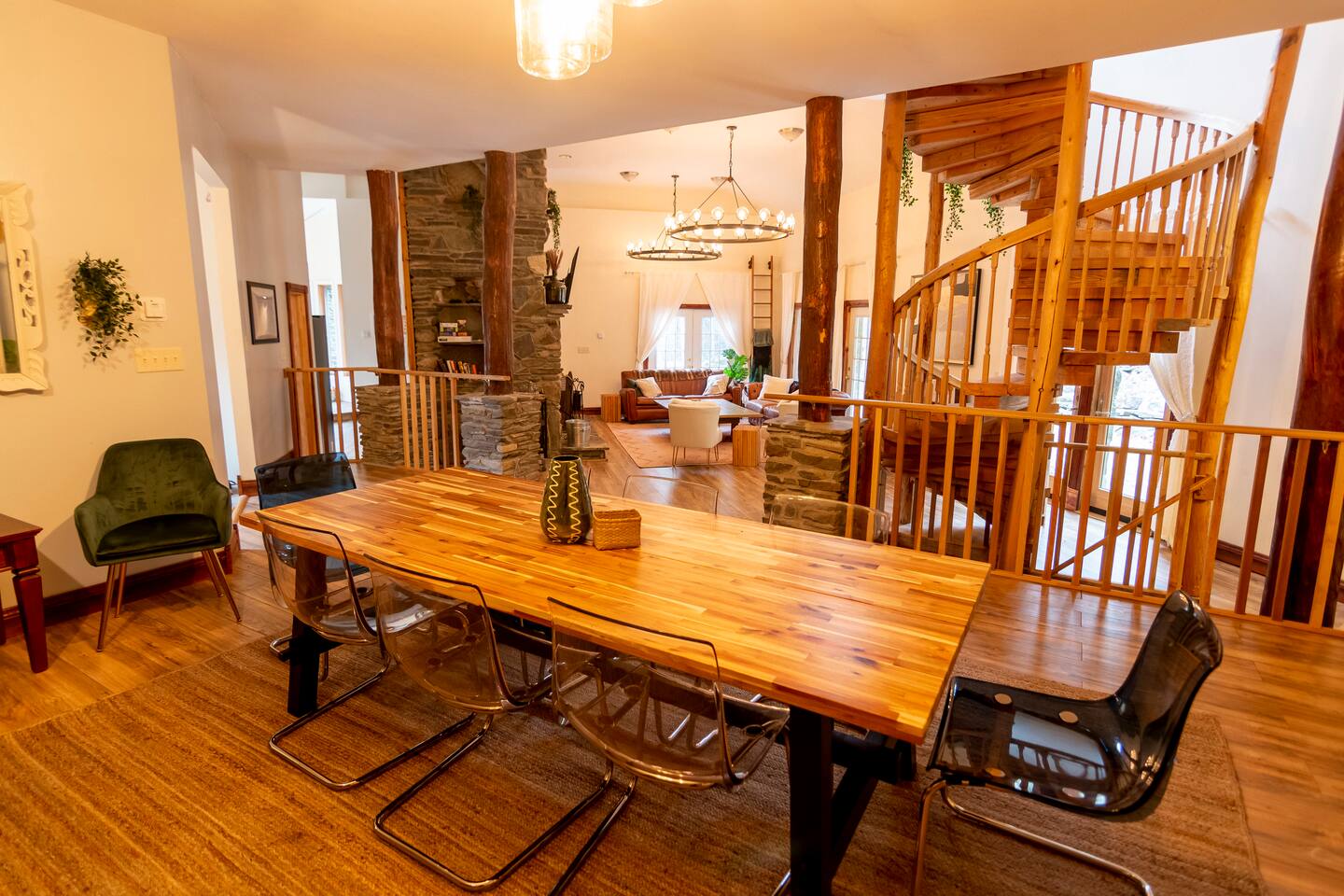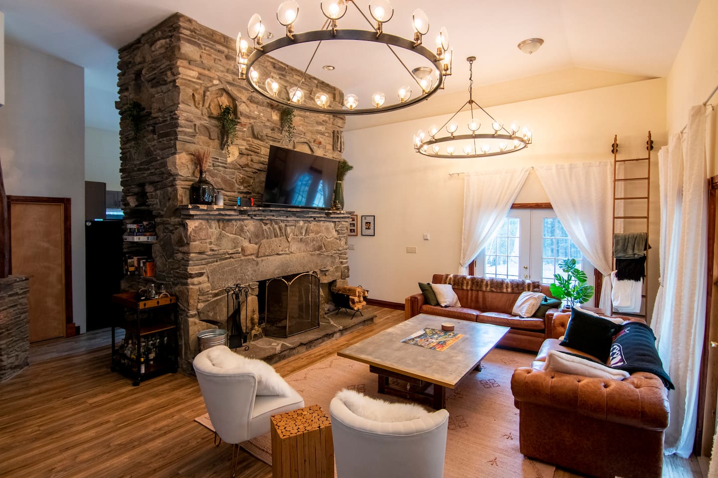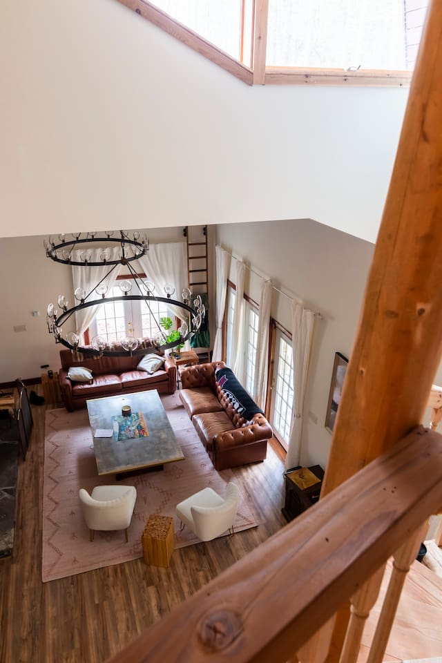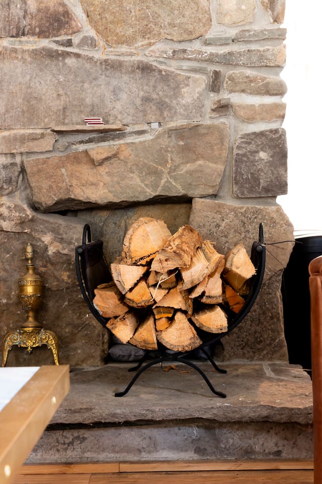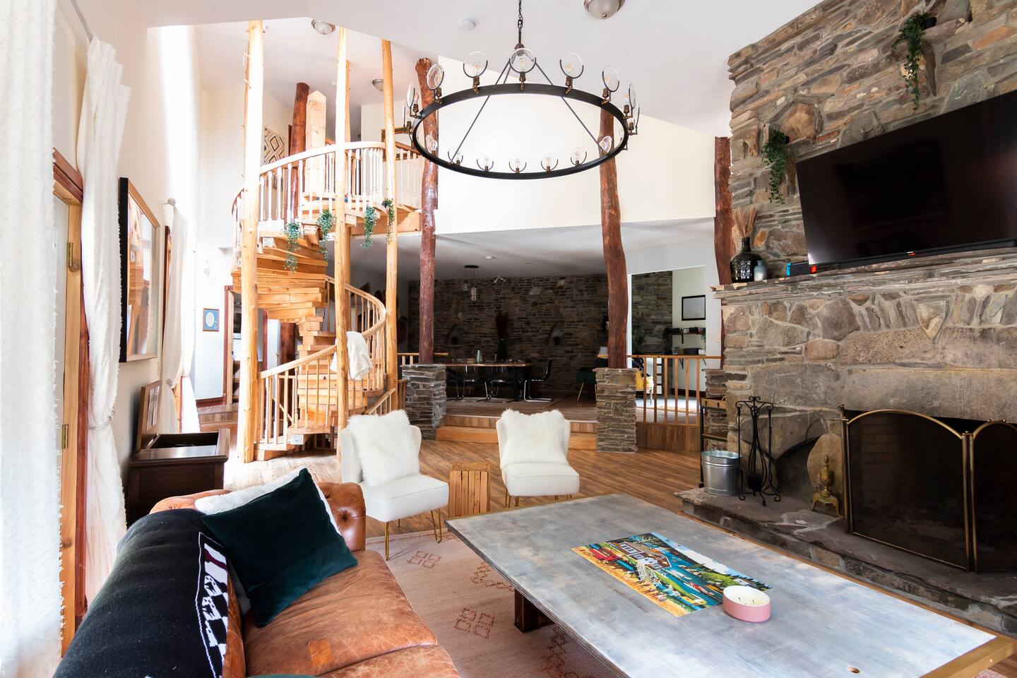 This one-of-a-kind renovated barn was thoughtfully designed for gathering. The open layout comfortably hosts groups while still offering quiet corners to unwind. The dramatic spiral staircase and massive stone fireplace anchor the main living space — perfect for shared meals, game nights, and long conversations by the fire. Step outside to explore 9+ acres of private woods and trails, or gather around the outdoor fire pit under the stars. Inside, playful design details like the bright silo lounge and hanging chair create cozy spaces throughout the home. You’ll feel immersed in nature while remaining just minutes from charming Catskills towns, restaurants, ski resorts, rivers, and hiking destinations. The home includes fully stocked kitchens, multiple gathering areas, TVs, a record player, Google speakers, board games, and everything you need for a memorable group getaway.