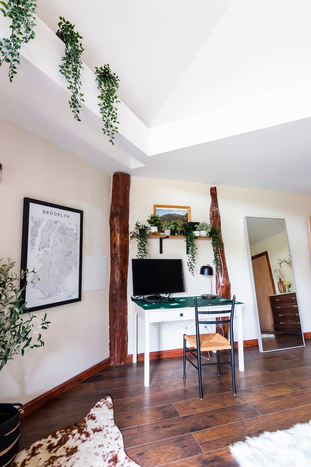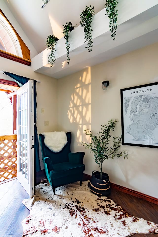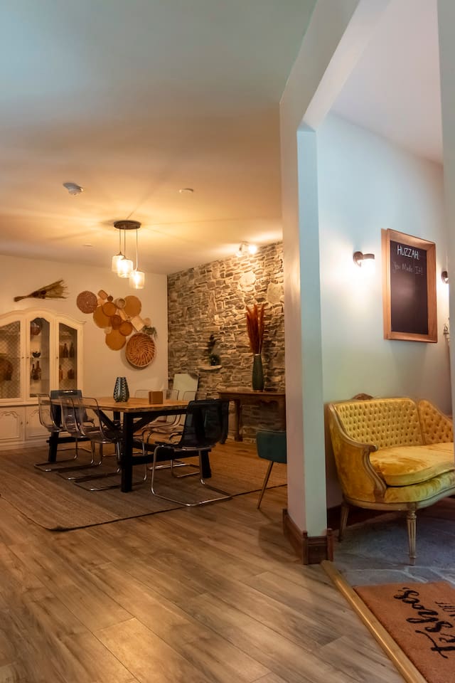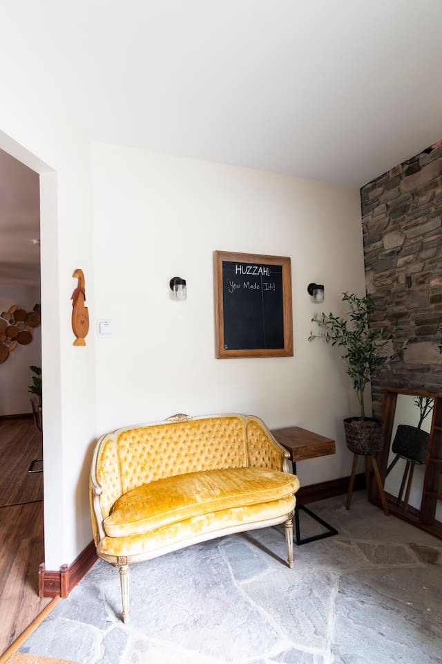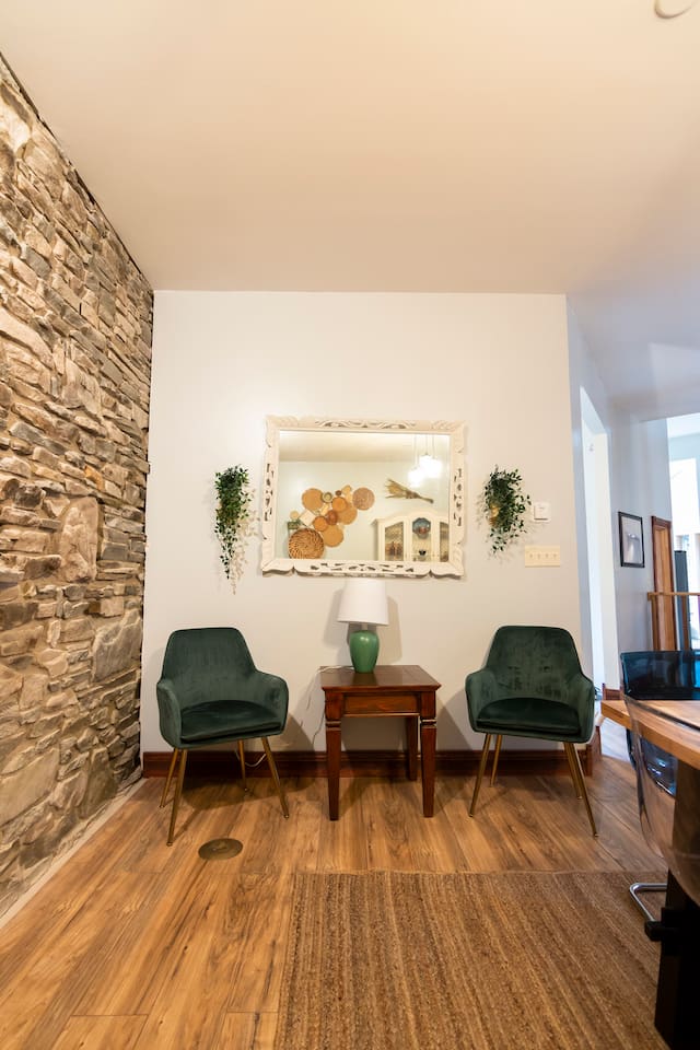 This one-of-a-kind renovated barn was thoughtfully designed for gathering. The open layout comfortably hosts groups while still offering quiet corners to unwind. The dramatic spiral staircase and massive stone fireplace anchor the main living space — perfect for shared meals, game nights, and long conversations by the fire. Step outside to explore 9+ acres of private woods and trails, or gather around the outdoor fire pit under the stars. Inside, playful design details like the bright silo lounge and hanging chair create cozy spaces throughout the home. You’ll feel immersed in nature while remaining just minutes from charming Catskills towns, restaurants, ski resorts, rivers, and hiking destinations. The home includes fully stocked kitchens, multiple gathering areas, TVs, a record player, Google speakers, board games, and everything you need for a memorable group getaway.
