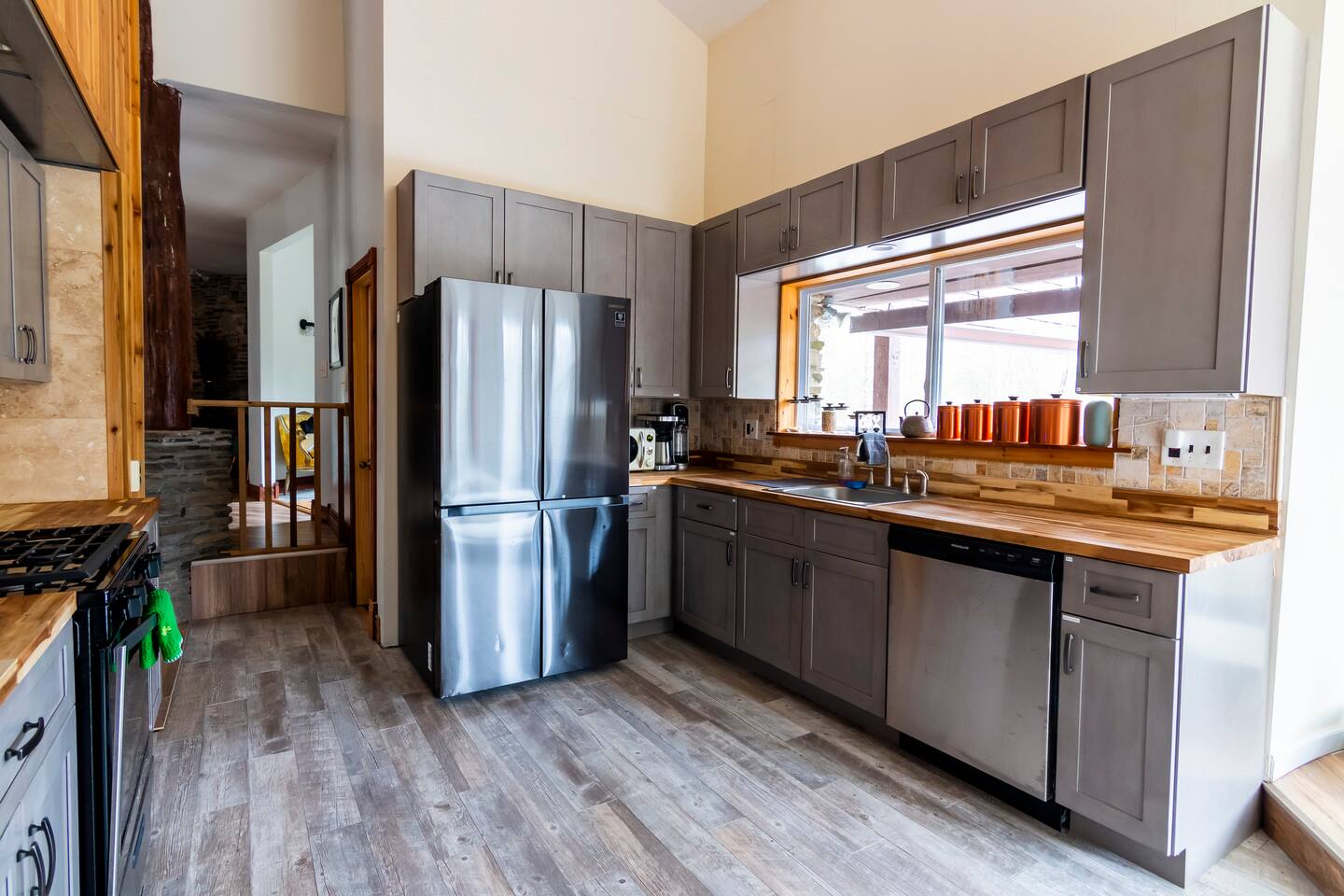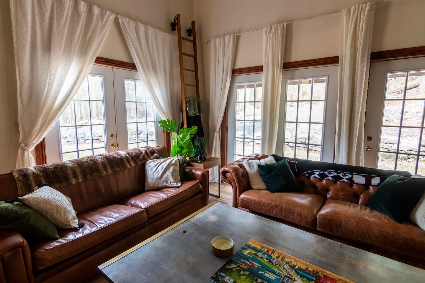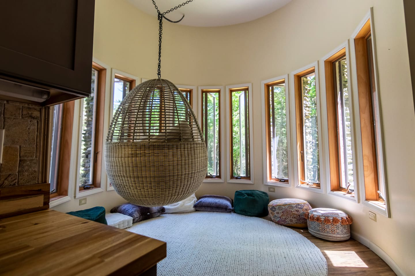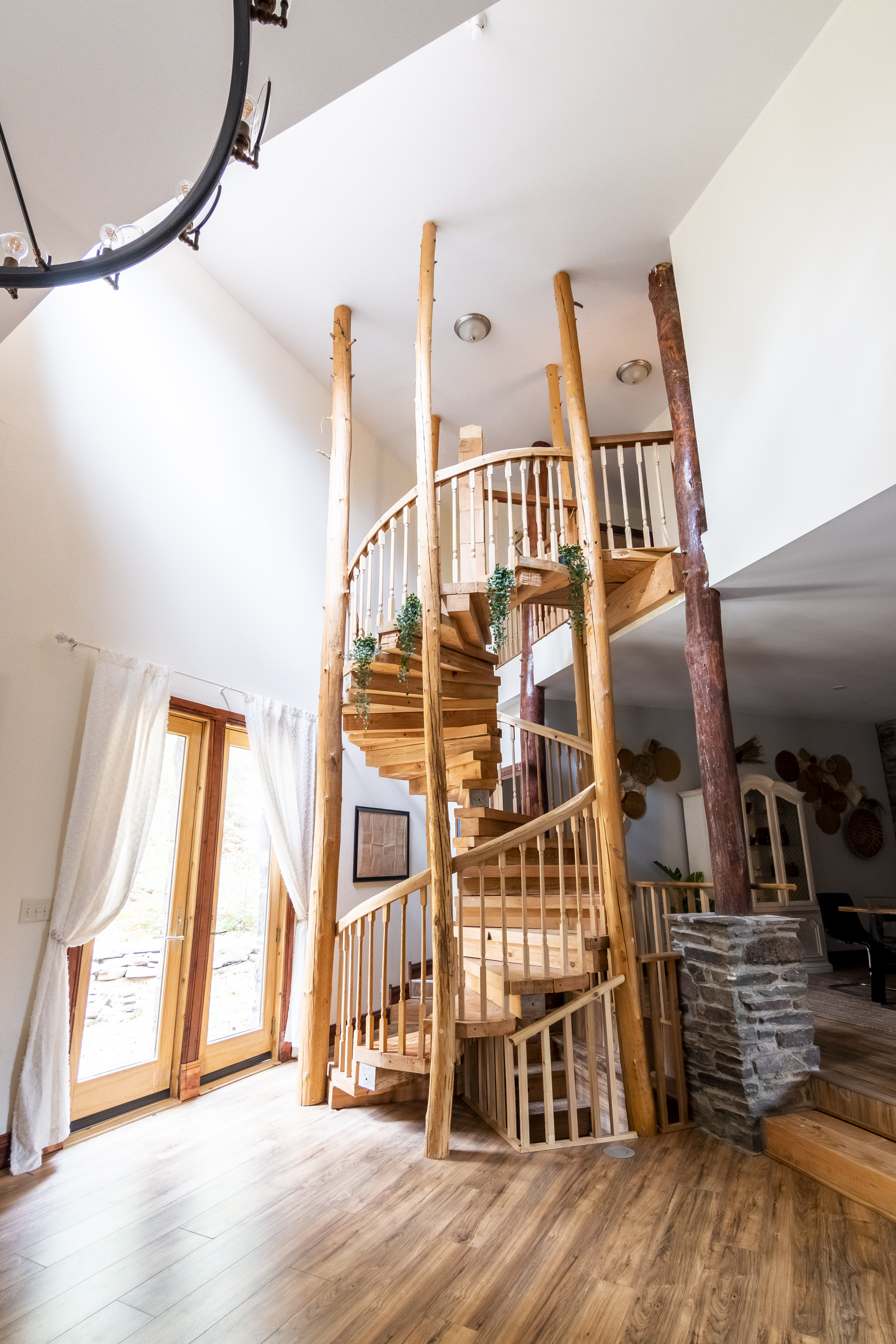 This one-of-a-kind renovated barn was thoughtfully designed for gathering. The open layout comfortably hosts groups while still offering quiet corners to unwind. The dramatic spiral staircase and massive stone fireplace anchor the main living space — perfect for shared meals, game nights, and long conversations by the fire. Step outside to explore 9+ acres of private woods and trails, or gather around the outdoor fire pit under the stars. Inside, playful design details like the bright silo lounge and hanging chair create cozy spaces throughout the home. You’ll feel immersed in nature while remaining just minutes from charming Catskills towns, restaurants, ski resorts, rivers, and hiking destinations. The home includes fully stocked kitchens, multiple gathering areas, TVs, a record player, Google speakers, board games, and everything you need for a memorable group getaway.
