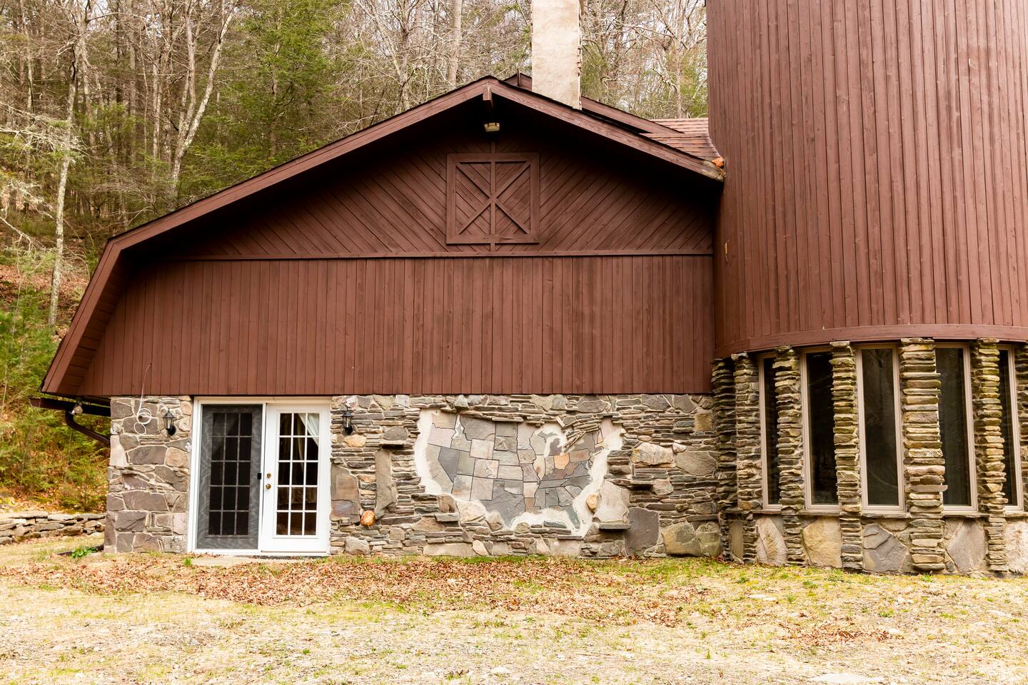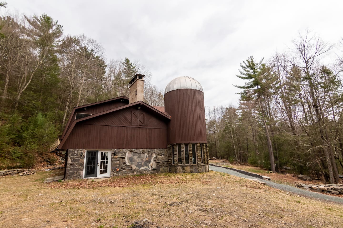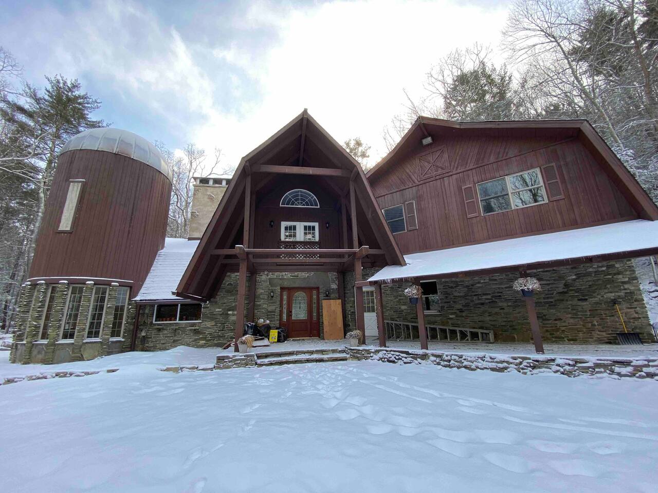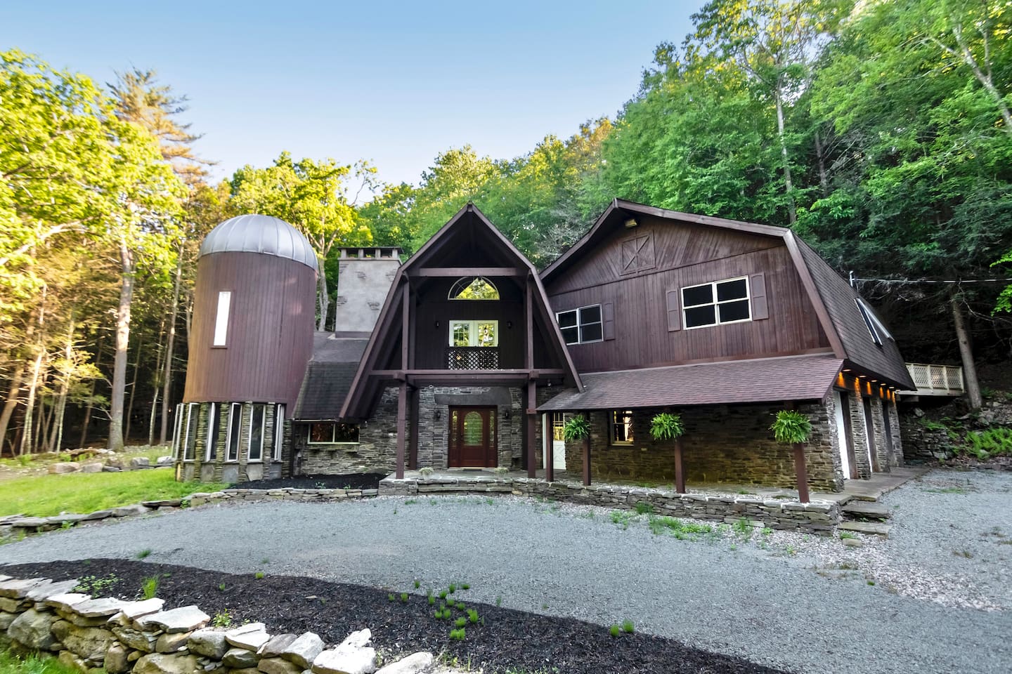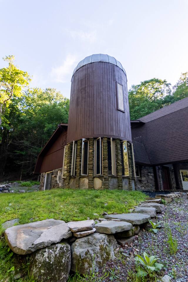 Escape to this architecturally striking Catskills barn set on 9 private acres. Designed for gathering, the soaring living room features a massive stone fireplace, dramatic spiral staircase, and cozy seating for long nights in. Perfect for birthdays, friend weekends, and family getaways, with private hiking trails, fire pit evenings, and playful nooks like the bright silo lounge and hanging chair comfortably sleeping 12 people across 4 bedrooms — all just 90 minutes from NYC.
